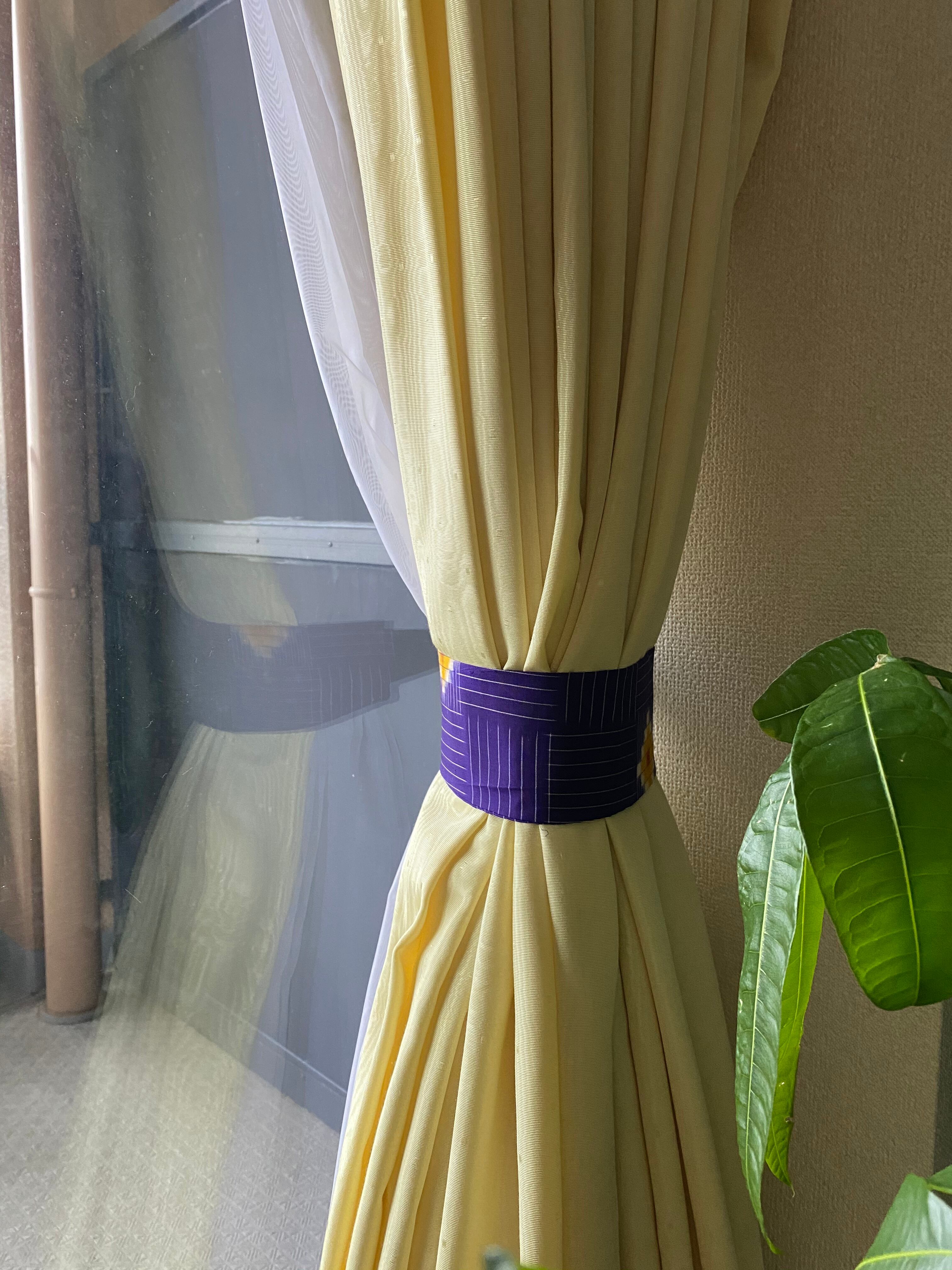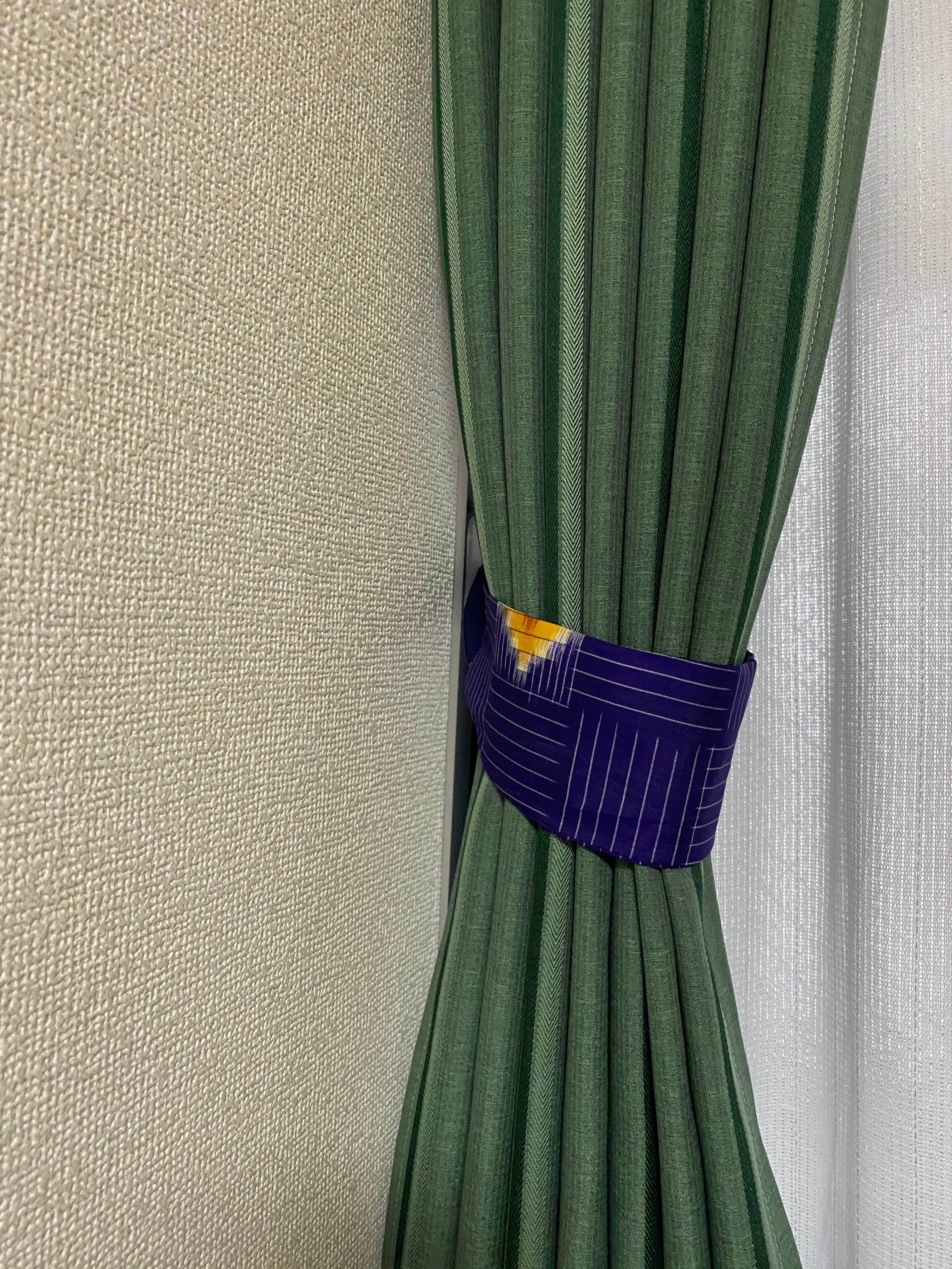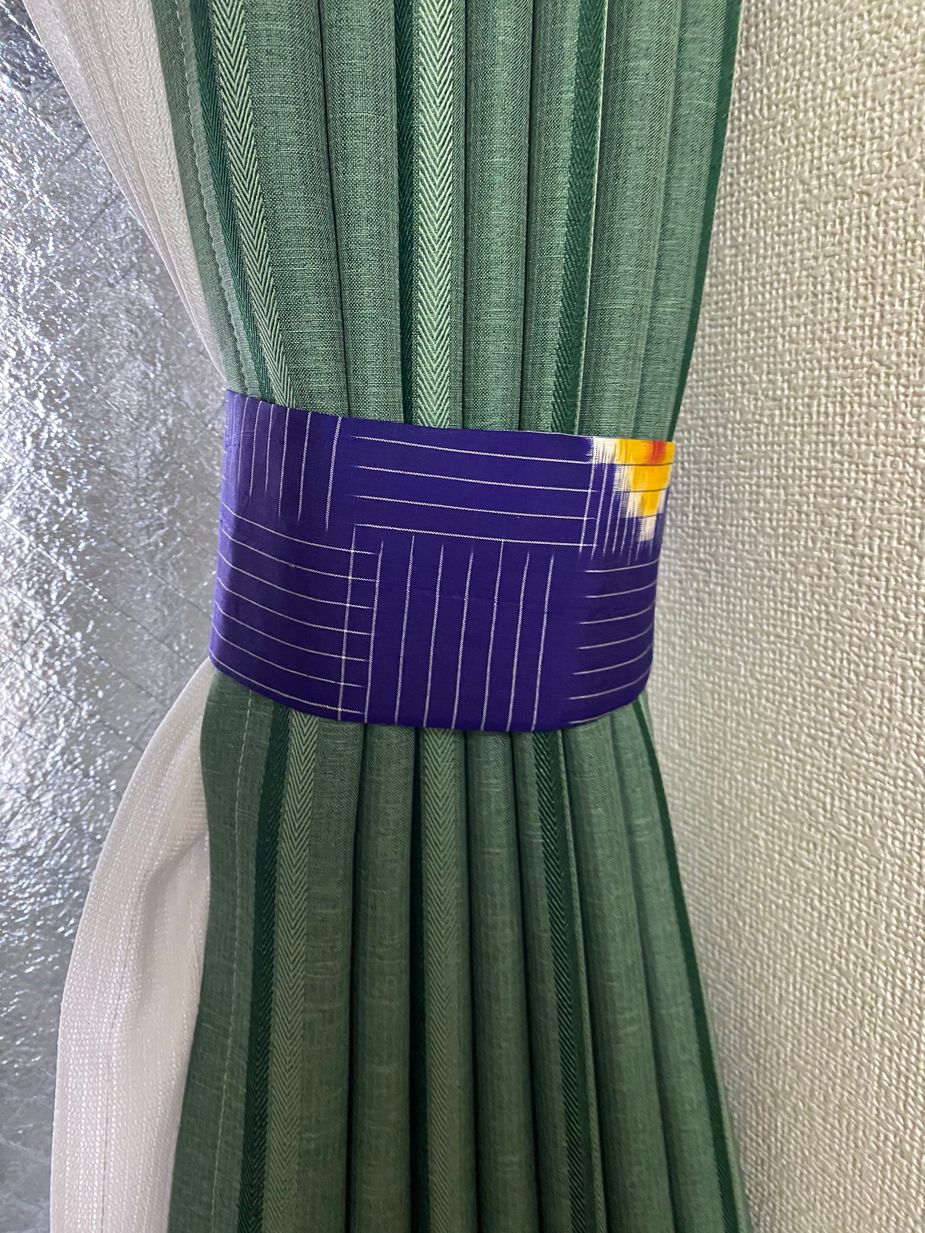 ハッキリした紫地に白色線(正確には織で点が連なっているので、線ではありません。伝わりにくくて、申し訳ないです。その織がキツくなくて、優しい、銘仙の味となっていると思います。)があります。ところどころに中心が朱色の模様が配置されているカーテン止めです。