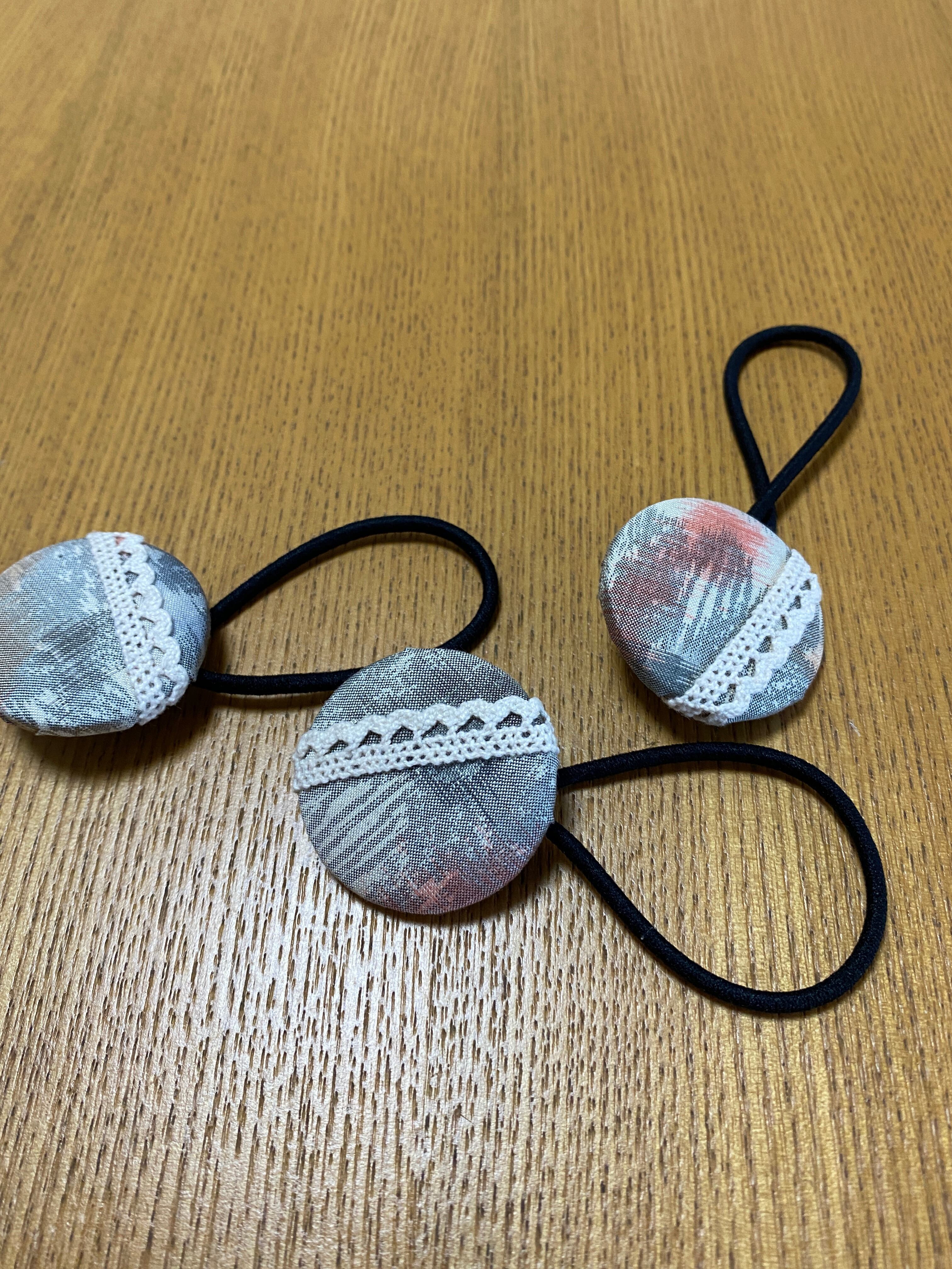 生成りの地にグレー色とピンク色の柔らかな柄行です。抽象画のようなタッチです。ワンポイントに中心をずらして綿レースをつけました。