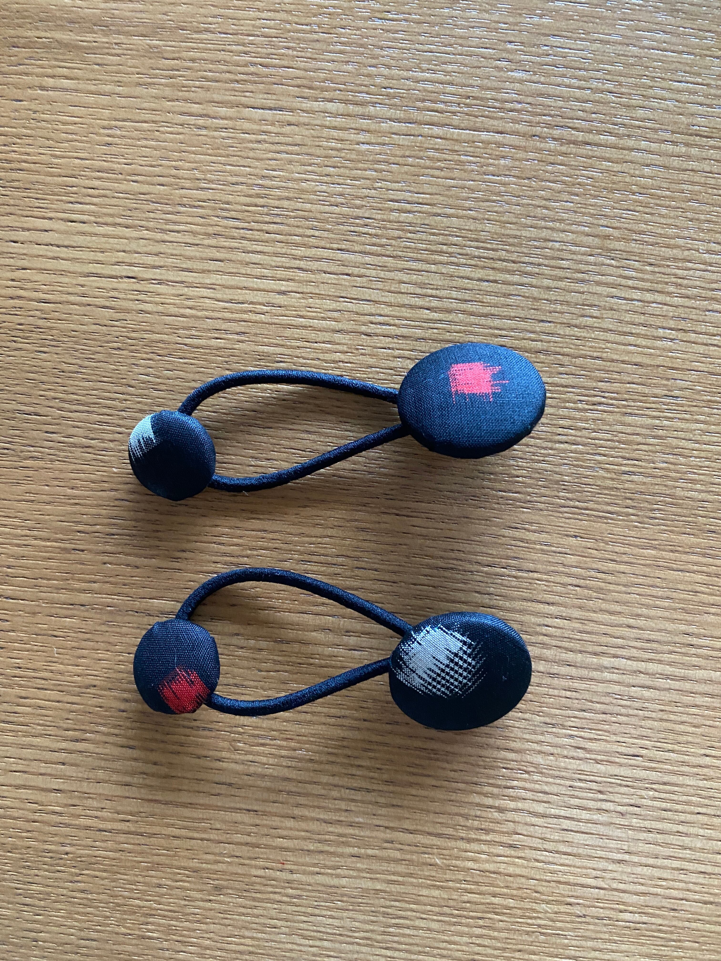 違うタイプのヘアゴムをご希望があれば作ります。ご参考に写真を載せております。また、同じ反物で制作したカーテン・タッセルも販売しているので、よろしければご覧ください。