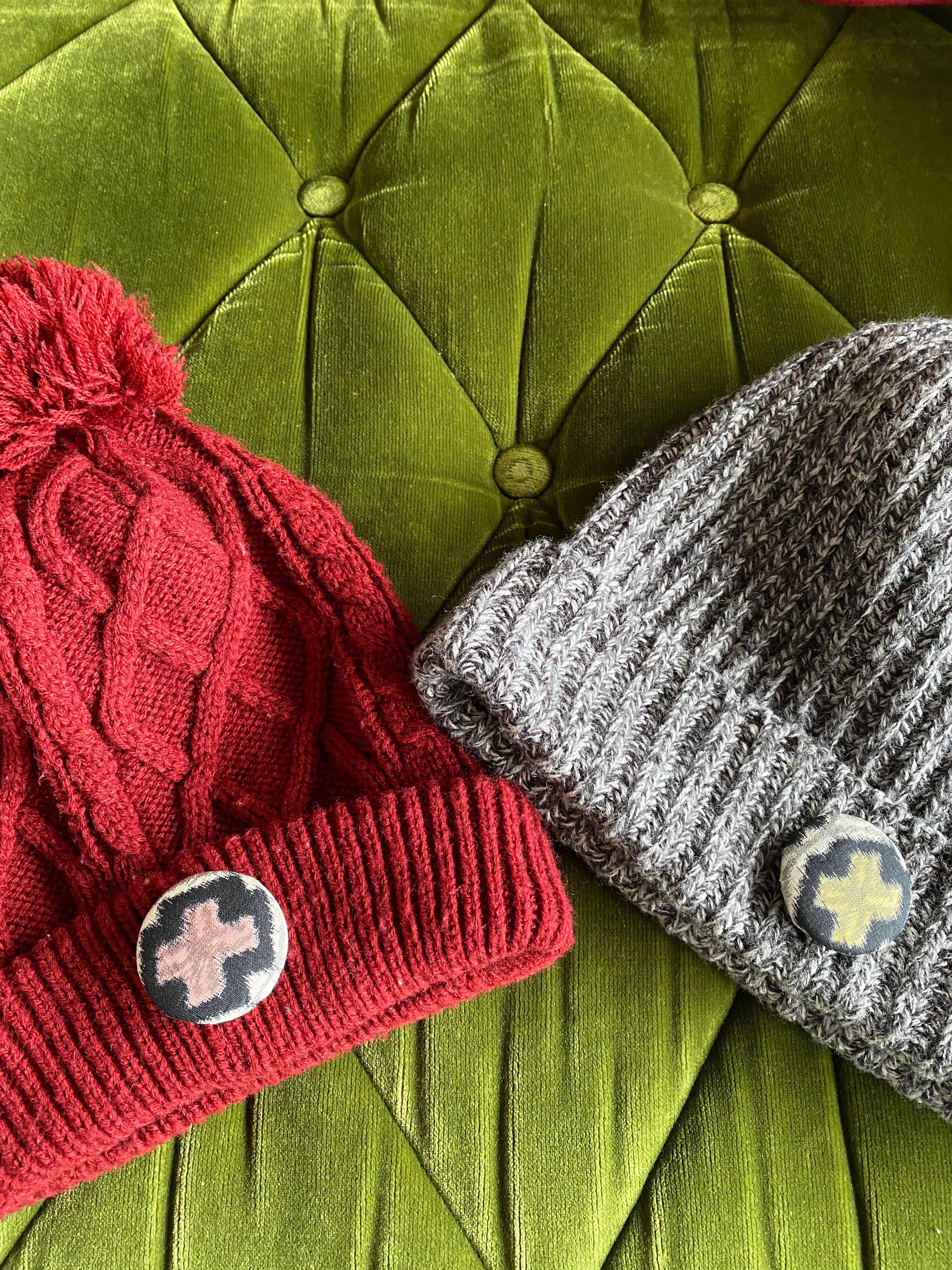 モダンな印象の銘仙生地から手作りピンです。2つセットです。