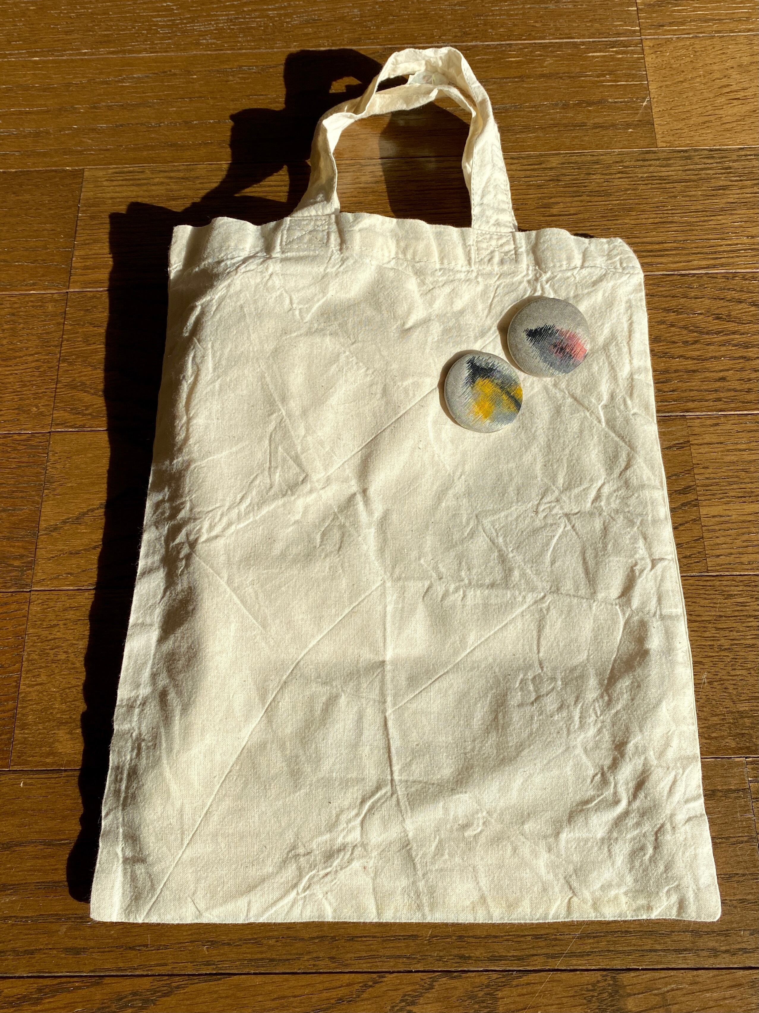 グレーよのうなシャンパンのようなお色地に優しい黒と様々な色の組み合わせ。(本当は木葉柄の反物ですが、ピンの大きさでは、葉のデザインとは分かりません。)
