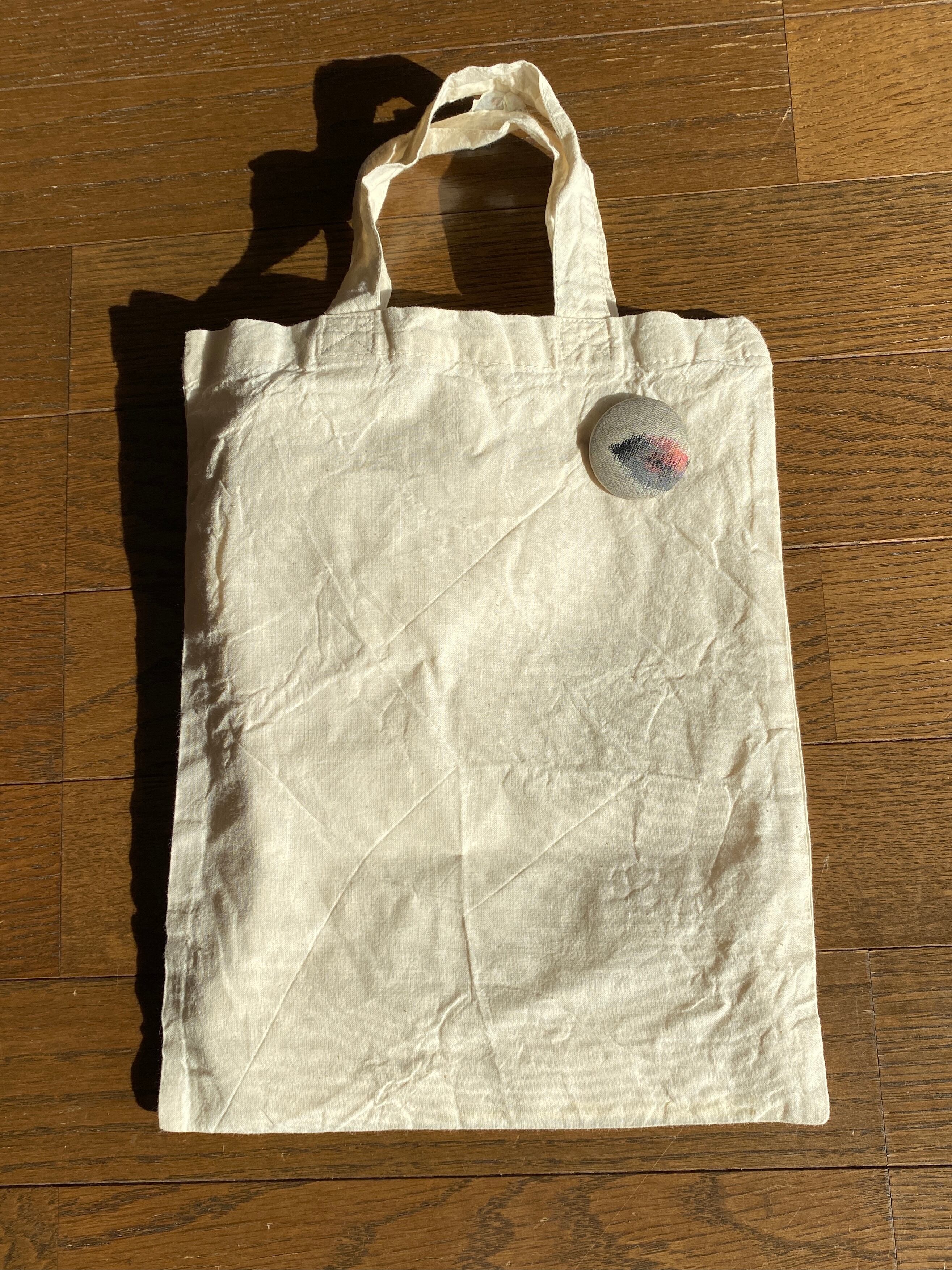 お辞儀をしないように中心をずらしてピンをとめました。あえて留める糸はフェルトと異なる色にしています。