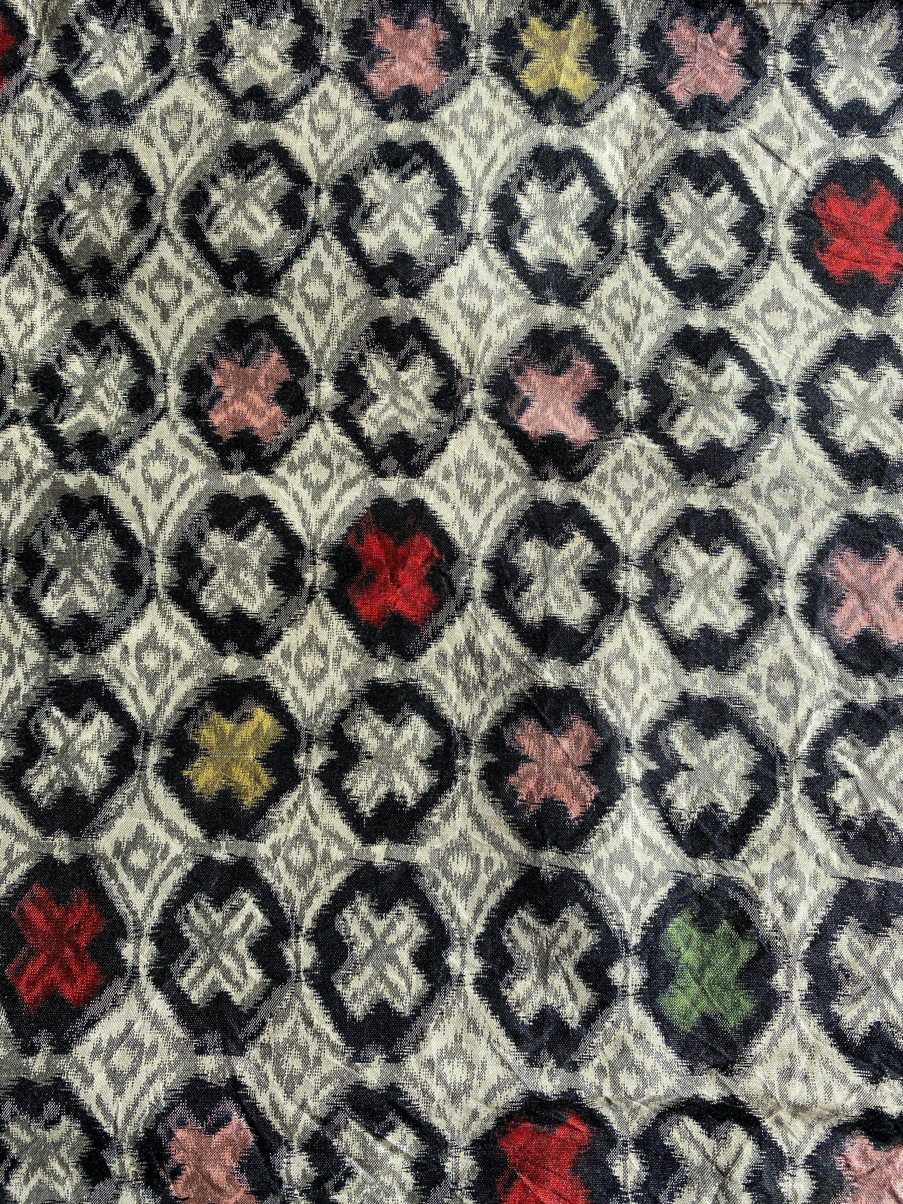 白地にグレー色の模様があります。その中に黒色✖模様が並びます。中心の様々な差し色からポップな印象も受けます。