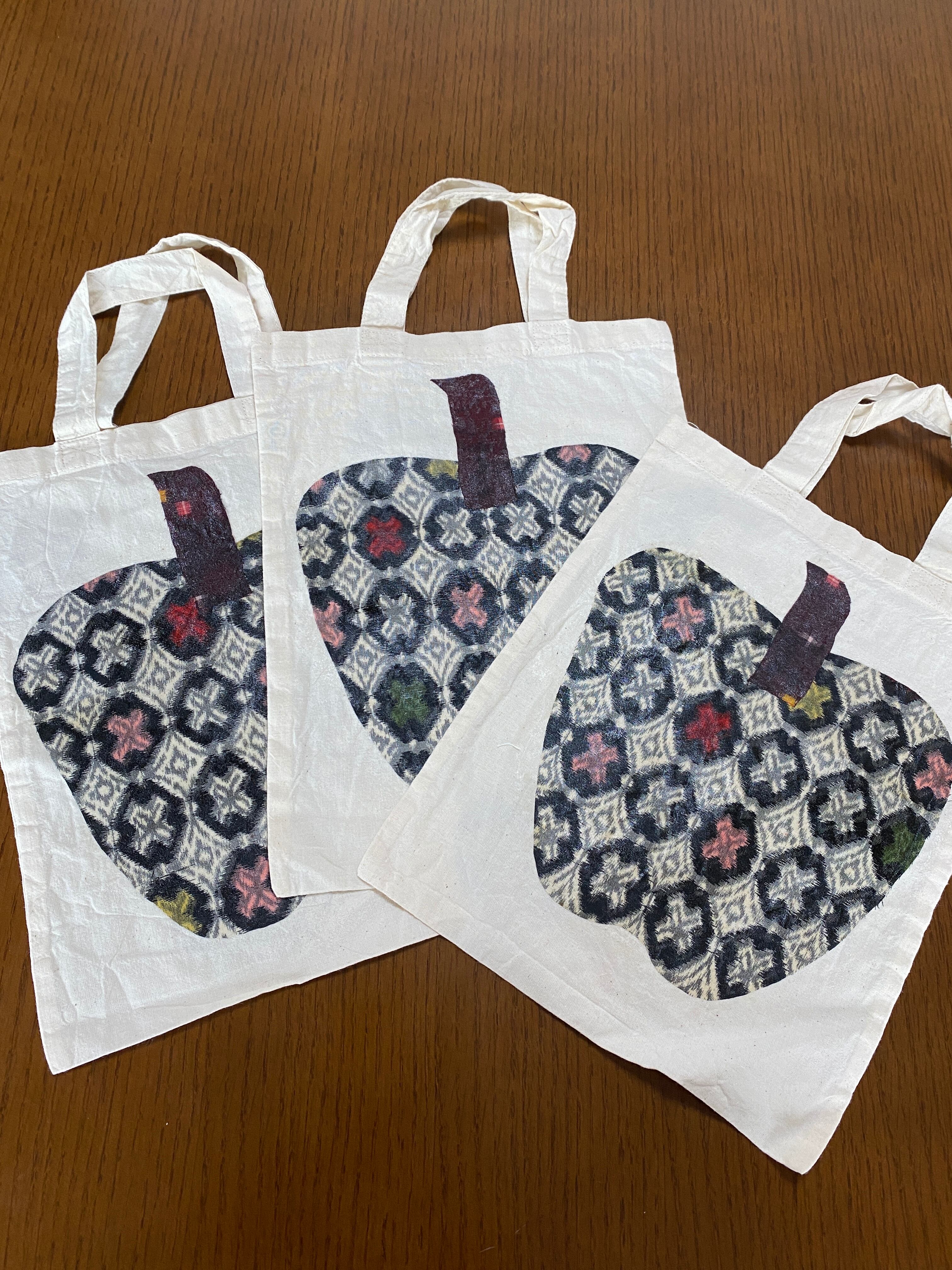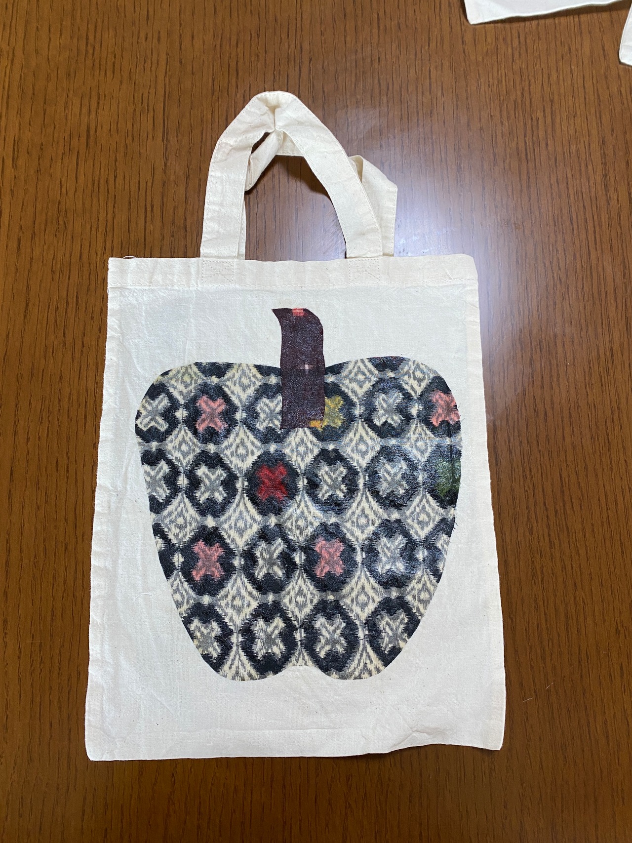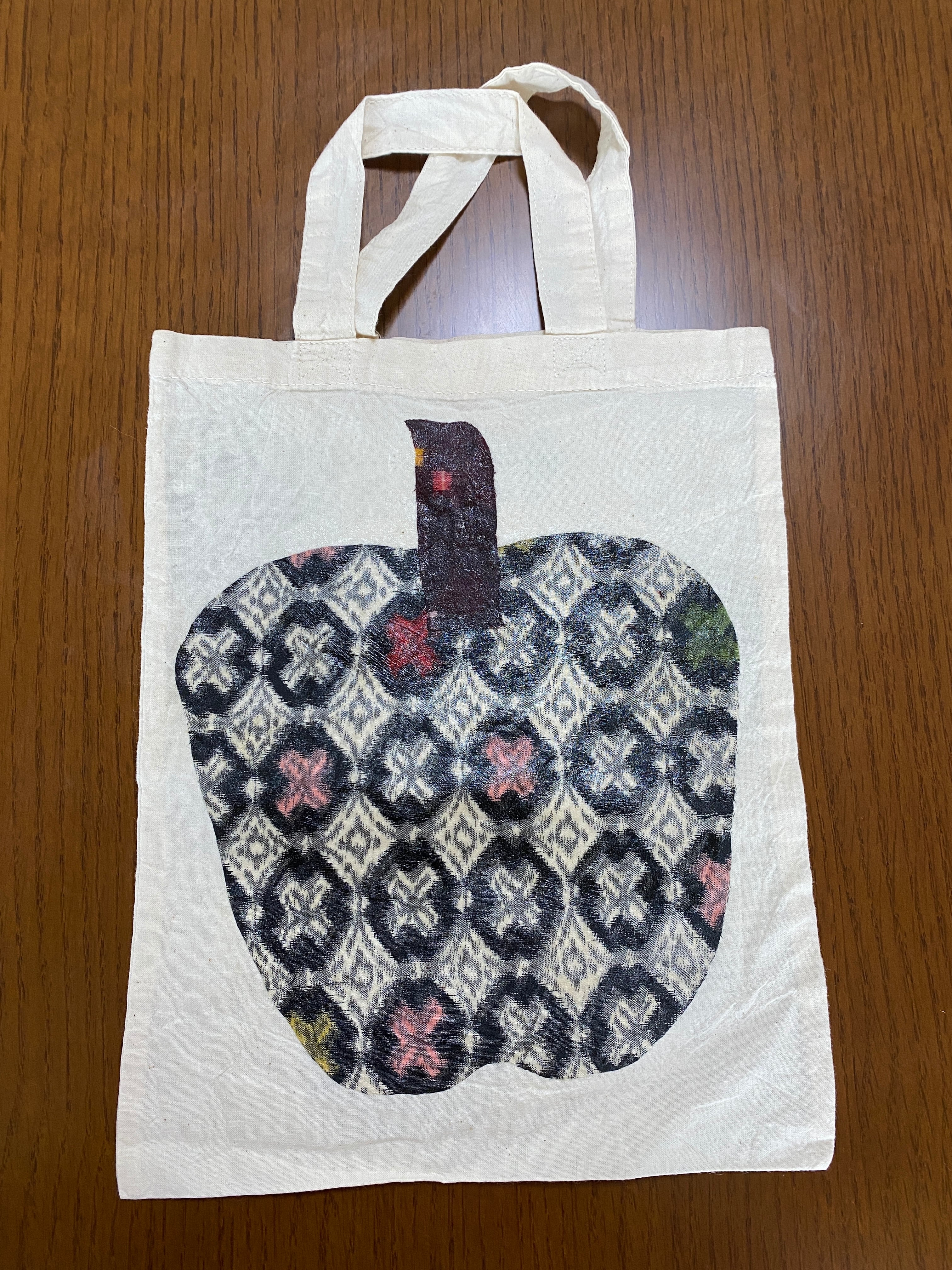 片面は大きなリンゴ。ポップな柄行の銘仙を使いました。