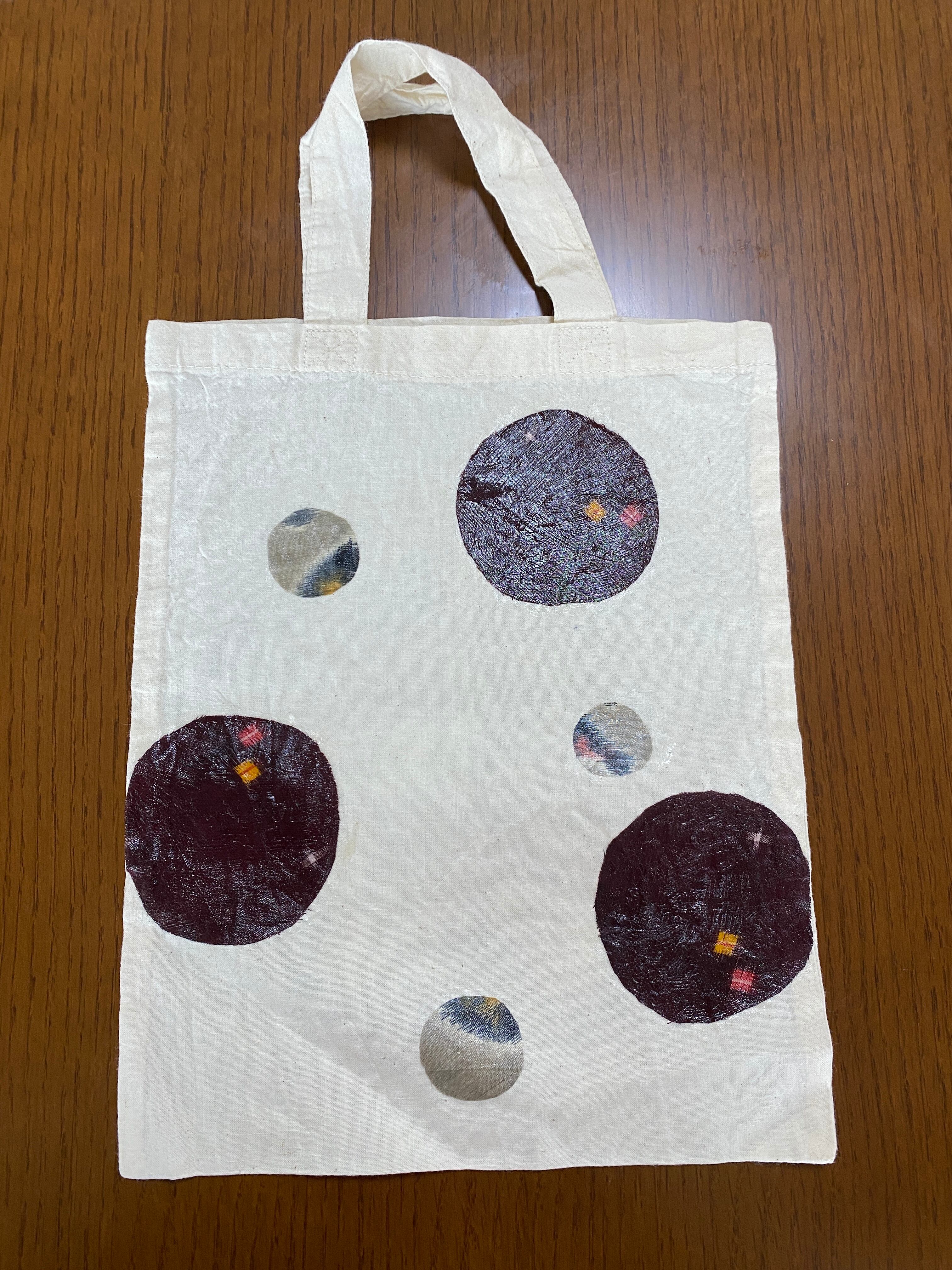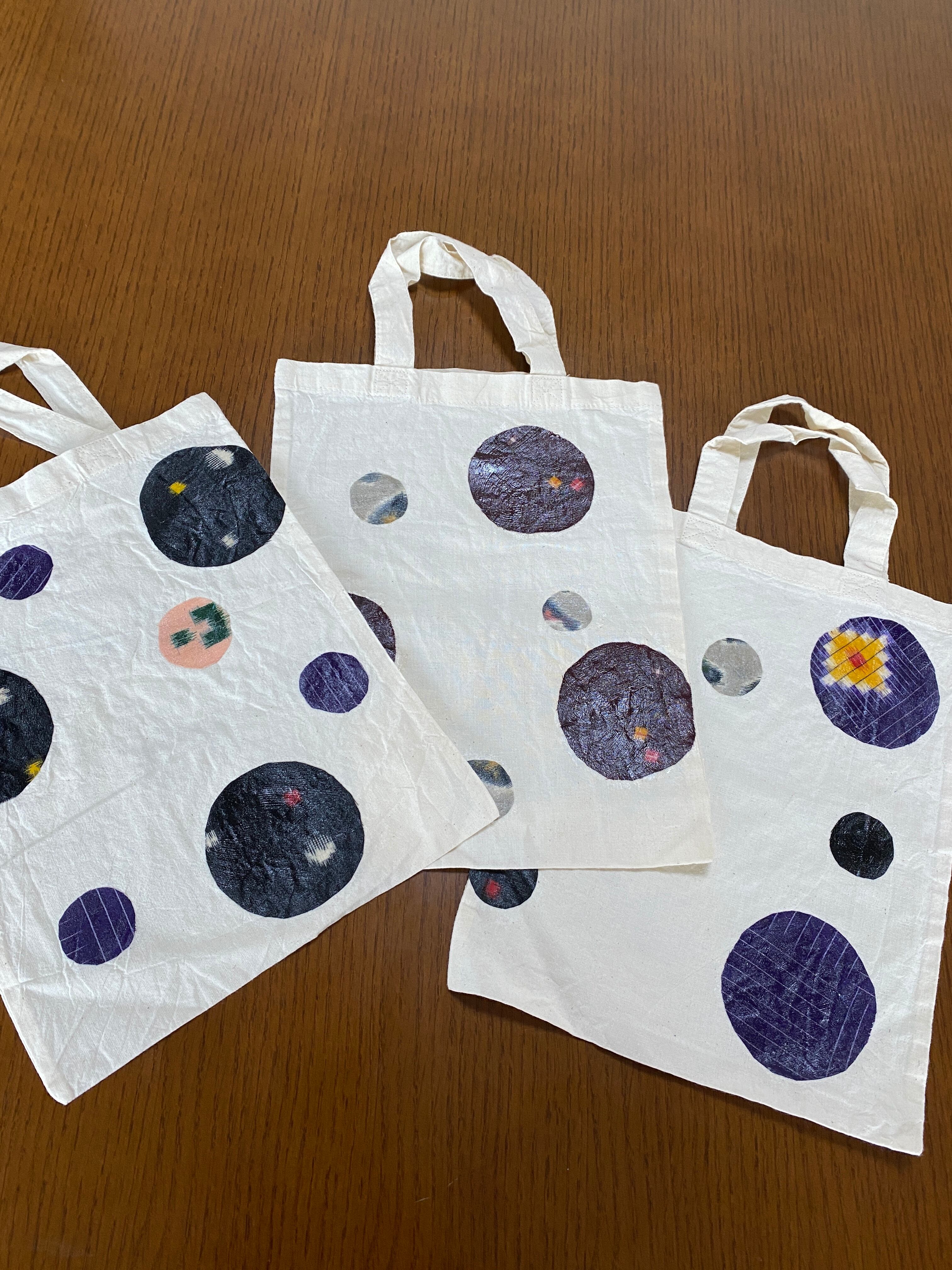 もう一面は、様々な銘仙をサークルに切り取って。3つで色合いを変えています。幾何学模様が宇宙に浮かんでる星みたいと個人的には。