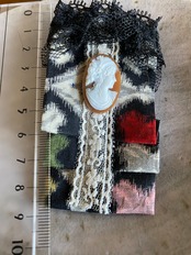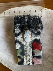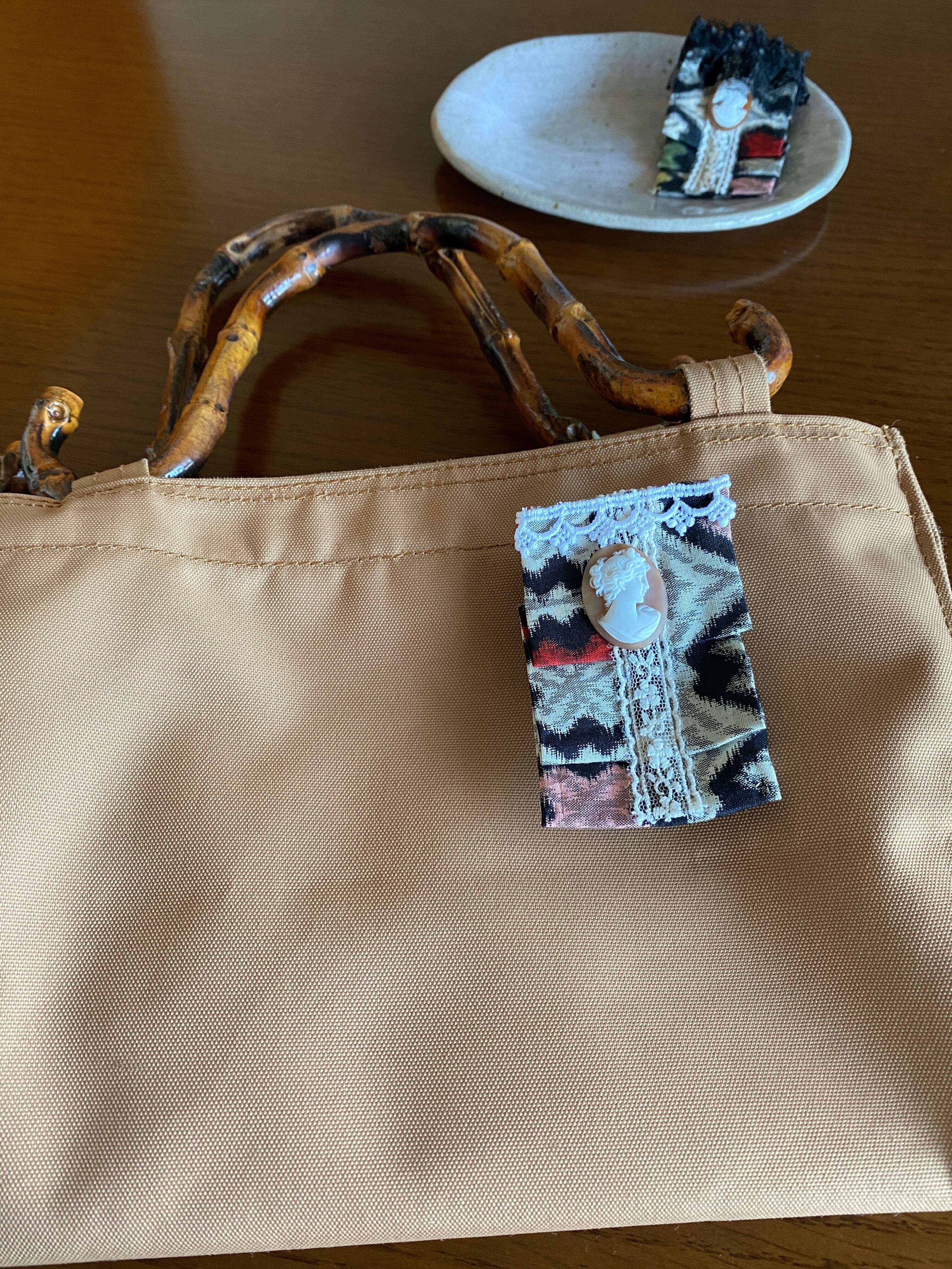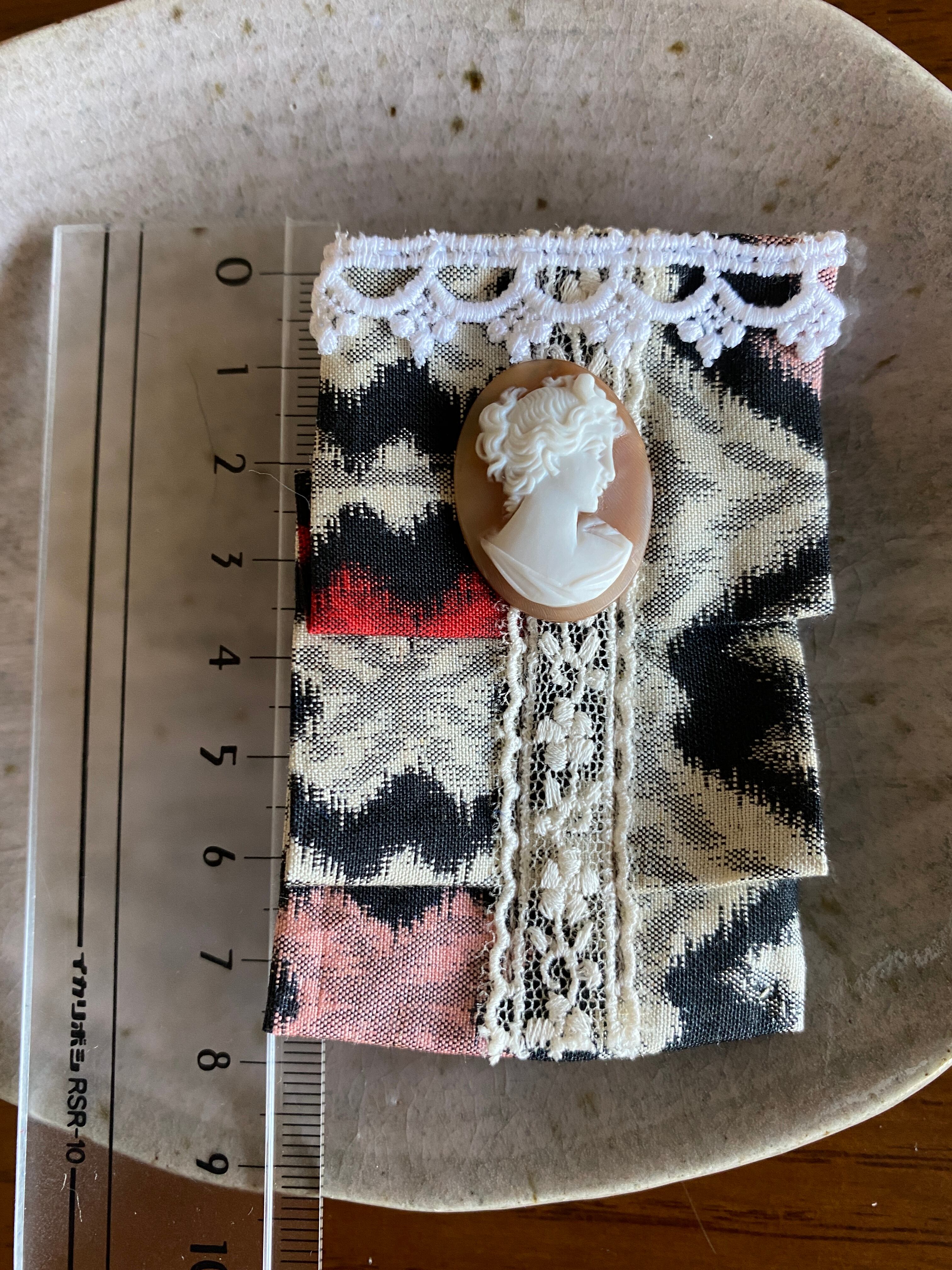 こちらは銘仙とシエルカメオ(天然貝)のコラボしたチャームです。全体として、大正モダンの世界観の作品だと思います。