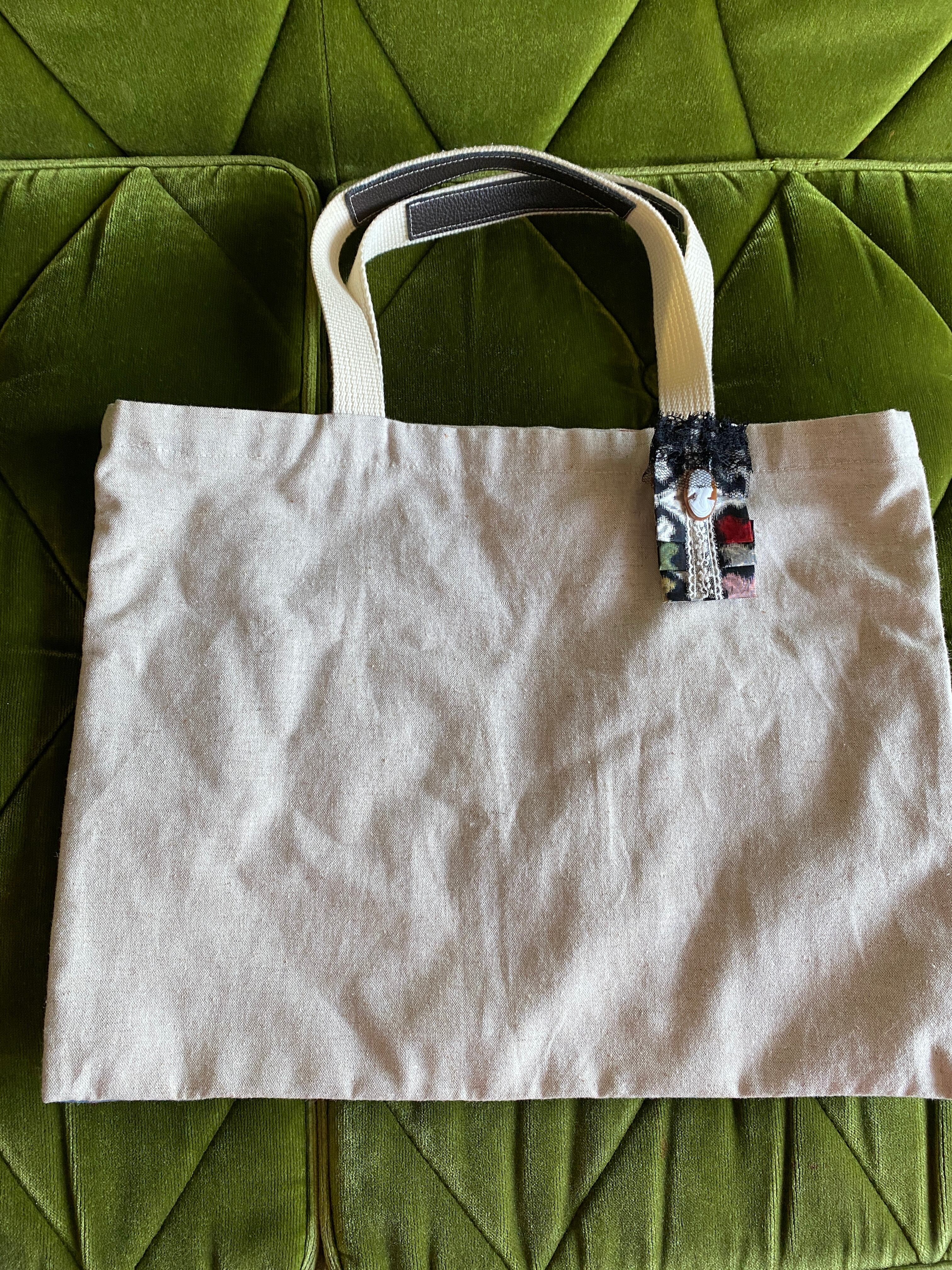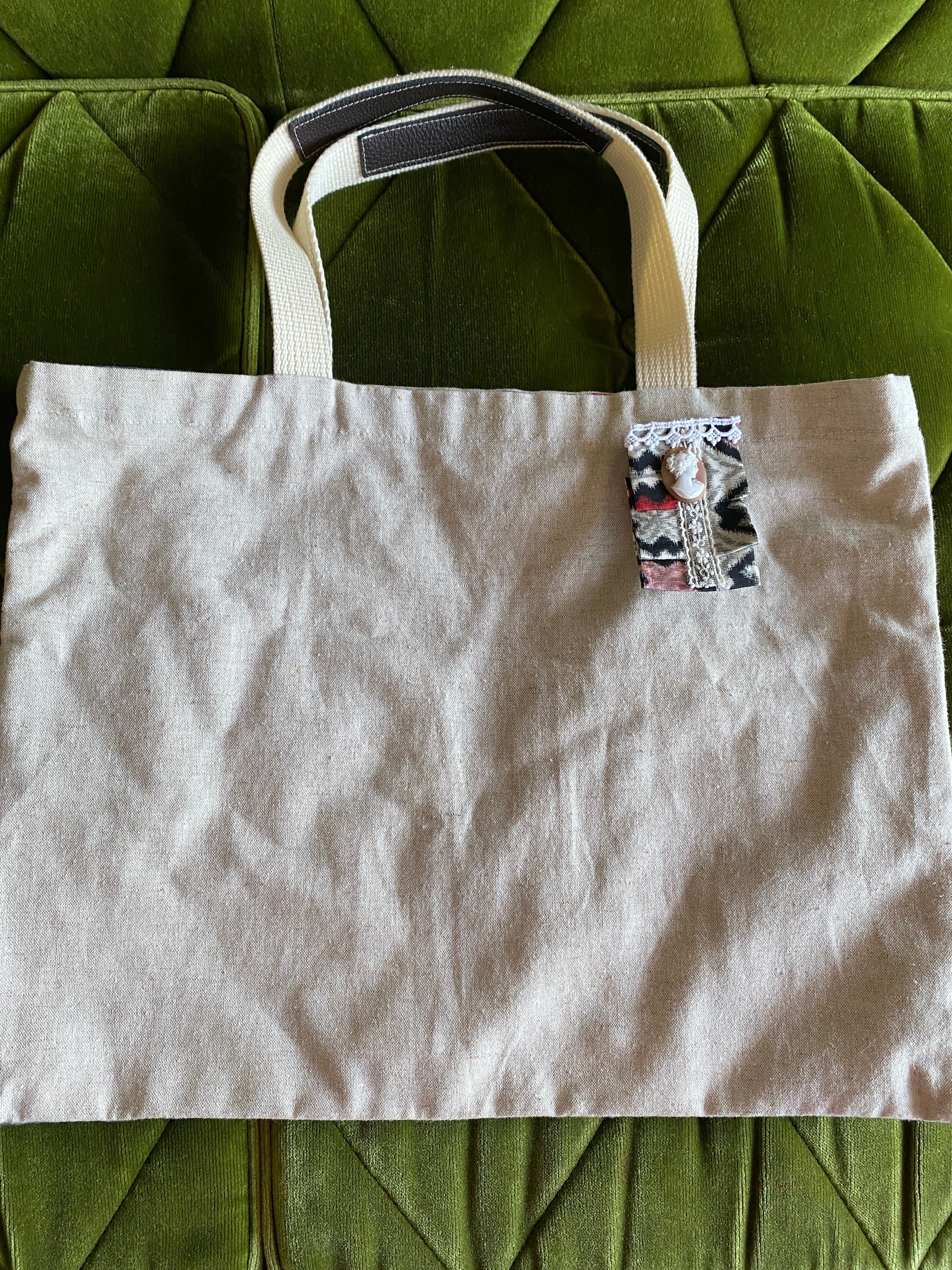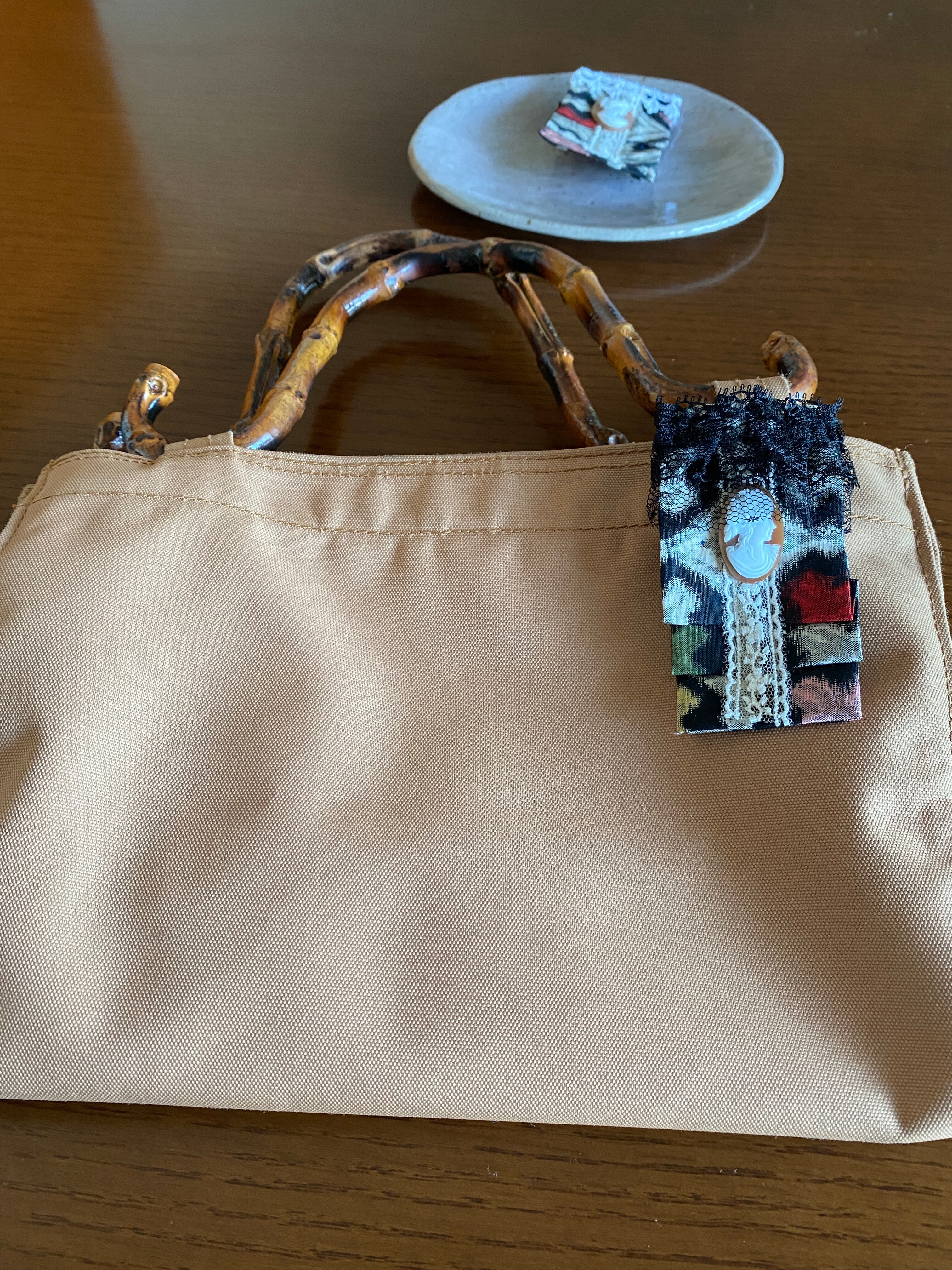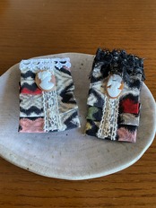 縦に折りたたんだことで、銘仙の個性的なデザインと色がハッキリしました。しかし、銘仙特有の織りが淡い印象で、きつくなりません。また、レースでさらに柔和な表情とナチュラル感がプラスされて、布バックなどにもなじみます。